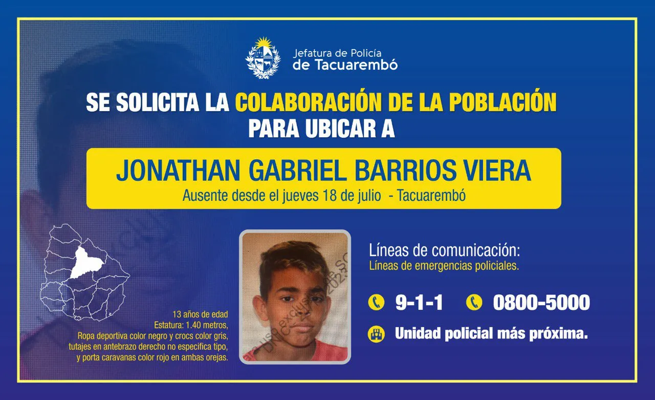 Desde Jefatura de Policía de Tacuarembó se solicita la colaboración de la población para ubicar al adolescente Jonathan Gabriel Barrios Viera, ausente desde el pasado 18 de julio en Tacuarembó.