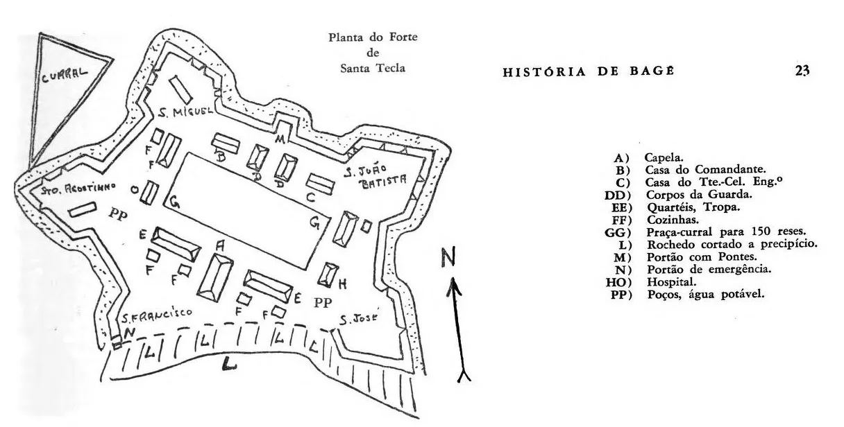 "Pasando, en noviembre de 1773, por la coxilha de S. Sebastião, a seis kilómetros y medio de la actual ciudad de Bagé, creyó prudente fundar una fortaleza, de características, en la época, consideradas inexpugnables, a la que dio el nombre del virgen mártir: SANTA TECLA"
