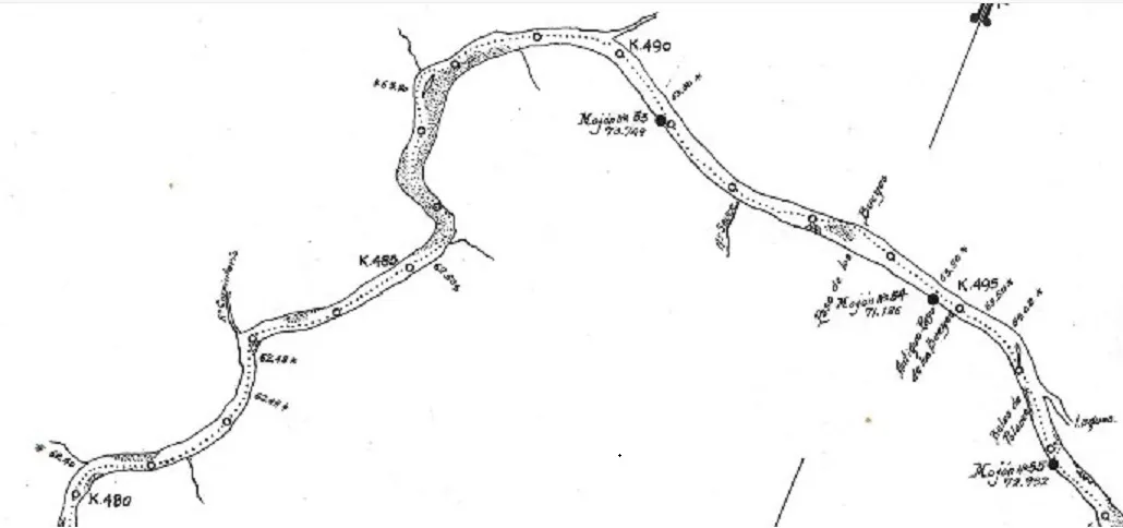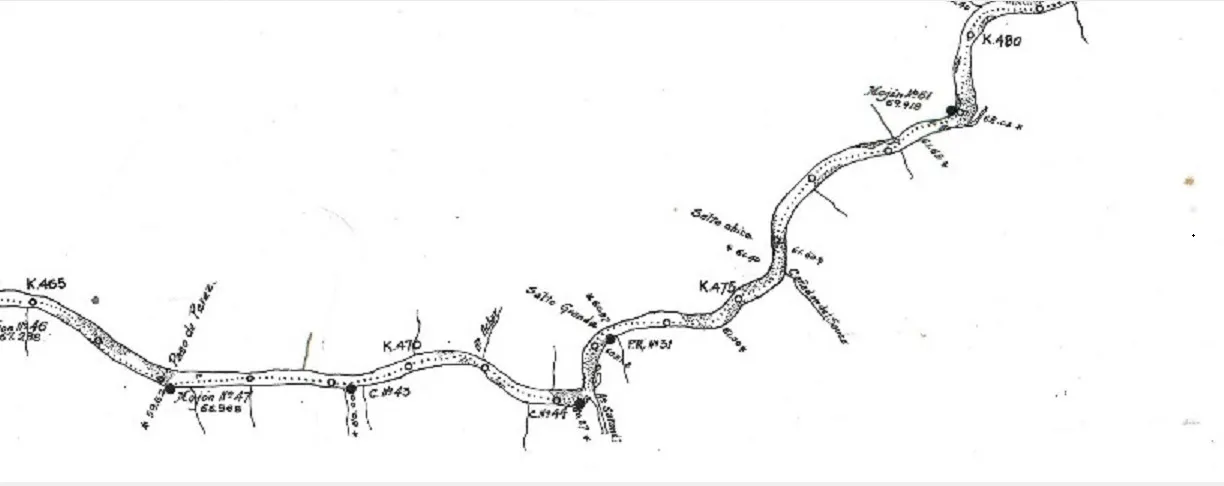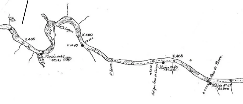 Para recorrer el río Negro en sus parajes originales recurrimos al plano CNEH33 MOP Planimetría del rio Negro desde su Boca en el río Uruguay hasta el KM 538 de MARZO año 1929.