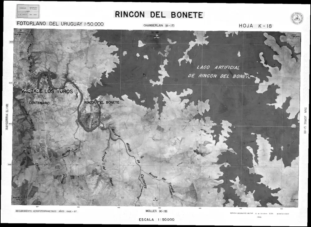 "Hoja X-17 “Chamberlain”. “¡Preparación de la cuadrícula 4 en la misma forma que la anterior. Hoja X-18 “Rincón del Bonete”. Ubicación de los mojones 001, 0005 y 0006 del Servicio Hidrográfico de la Marina, correspondientes a las islas del embalse del Río Negro, en la cuadrícula 1, reducción panto gráfica (del 5.000 a] 20.000) de las cartas de dichas. islas, a los efectos de ubicarlas en las cuadrículas 1 y 2 de esta hoja."
